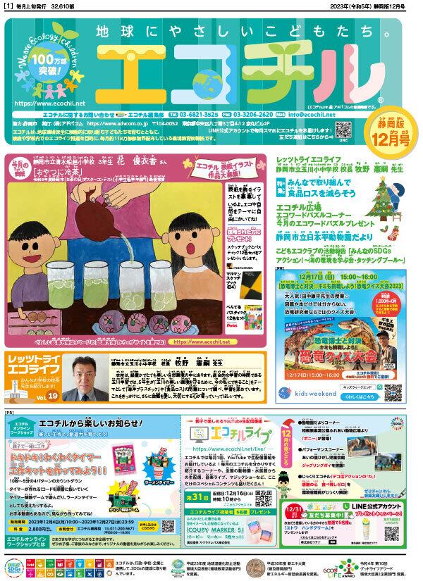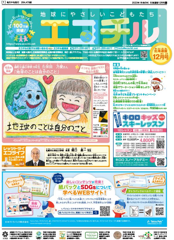 「エコチル」とは、「エコロジーチルドレン」の造語で、「子どもたちに、もっと環境に関心をもってもらえる機会をつくろう」「地域社会と学校、家庭をエコでつなぐプラットフォームになろう」という想いから、2006年に創刊いたしました。毎月公立小学校で先生から生徒へ配布しています。オールカラーの紙面では、図やイラストをたくさん使って、たのしい紙面構成をしながら、さまざまな切り口から環境問題や食育など をご紹介しています。